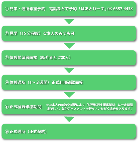 まず、事業所へご連絡ください。その際に見学日または面接日を決定します。なお、見学のみの場合はご本人お一人でも構いません。
